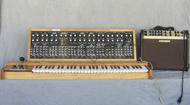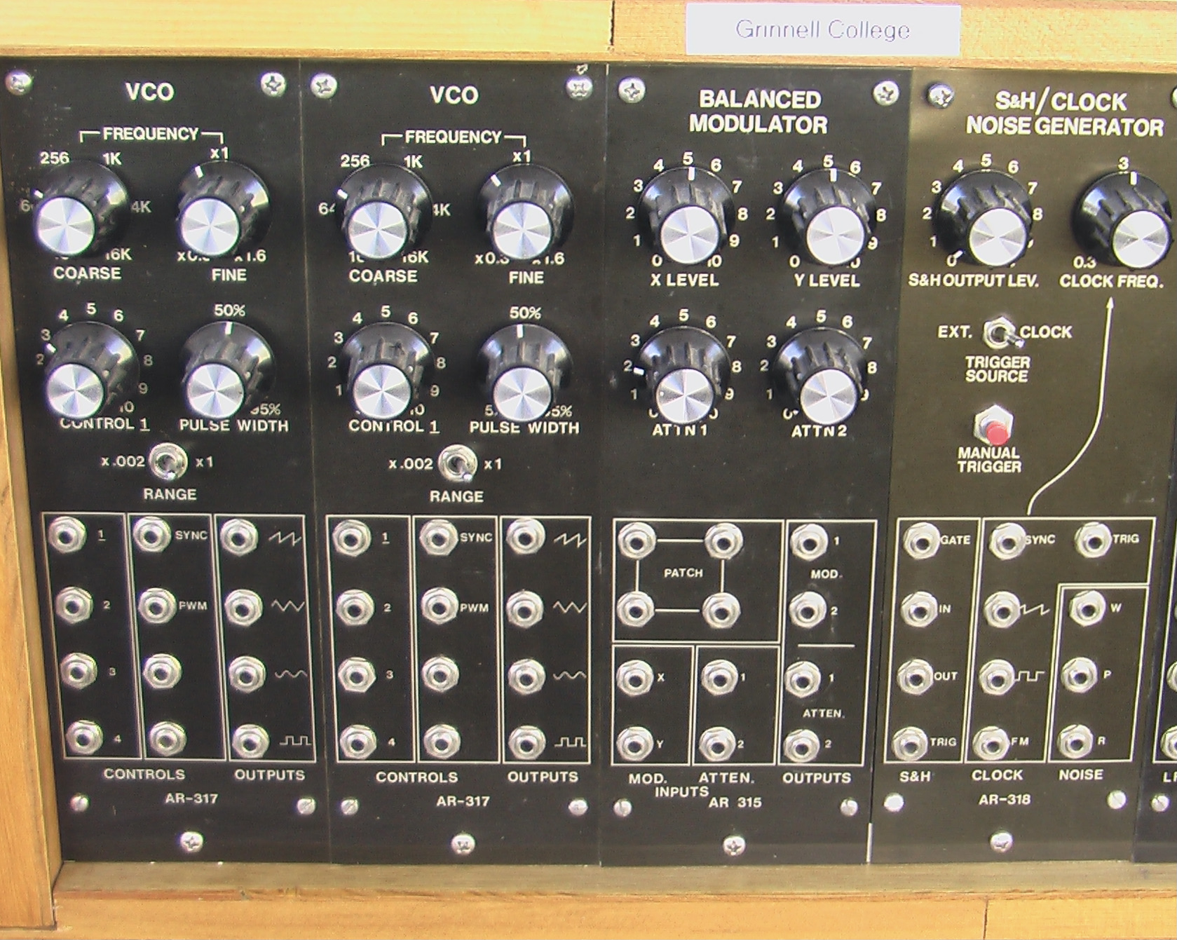 The operator of this synthesizer sits or stands in front of the instrument’s keyboard facing the bank of modules mounted in their case. The operator chooses which modules a given signal will pass through (accomplished with the patch cords) and what modifications to the signal will take place (with the nobs and switches on a given module) in order to sculpt an audio product that either imitates the sound of an acoustical instrument or produces a totally new sound. With the keyboard controller, the synthesized sounds can be reproduced at different pitch levels and strung together to play melodies. It is unclear whether or not this is a monophonic instrument; the synthesizer’s Output and Power module has two outputs, but the catalog that came along with the instrument (Aries 1977) makes no mention of this being either a one-voice or a two-voice instrument (many synthesizers from this era were monophonic instruments that could produce polyphonic textures only by recording one line at a time, realized on the synthesizer, onto a multi-track tape).