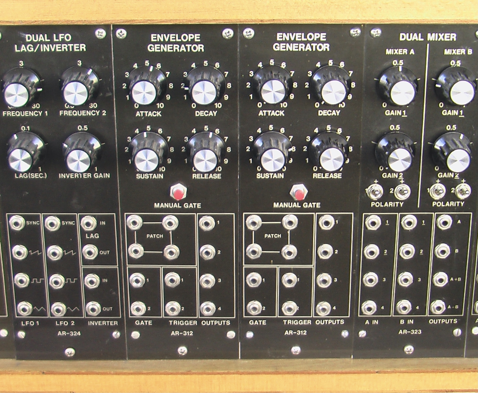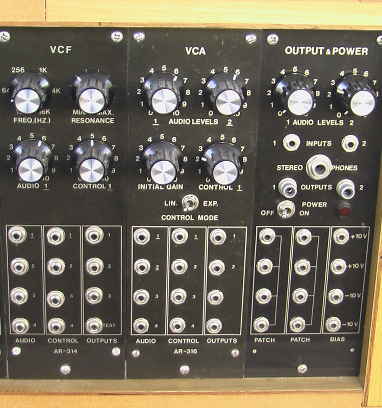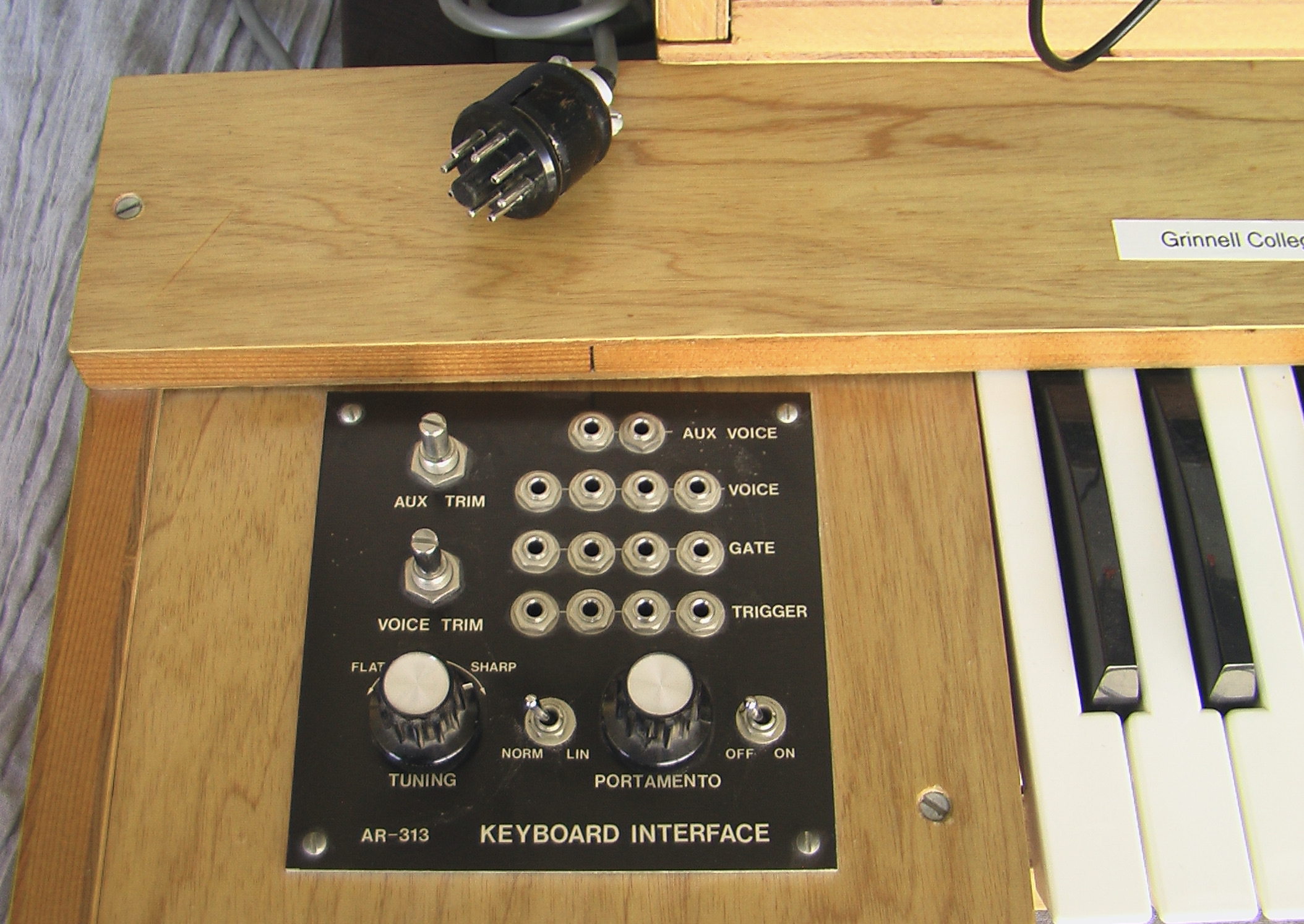In order to be used, the synthesizer must be plugged into a standard AC electrical socket. The heart of this synthesizer is an ensemble of eleven modules housed in a plywood case. The eleven modules in this synthesizer are: [in detail #2:] two voltage controller oscillators [VCOs] (AR-317), one balanced modulator (AR-315), one sample & hold [S&H]/clock noise generator (AR-318); [in detail #3:] one dual low-frequency oscillator [LFO], lag, and inverter (AR-324), two envelope generators (AR-312), one dual mixer (AR-323); [in detail #4:] one voltage controlled filter [VCF] (AR-314), one voltage controlled amplifier [VCA] (AR-316), and one output and power module (AR-326). These modules, each serving one or a few specific sound synthesis functions, are connected to one another by means of patch cords with NTT 311 miniature phone jacks at each end (some of these can be seen in gallery #1). The primary controller for this synthesizer is a five-octave keyboard. A keyboard interface module (AR-313) is mounted on the plywood keyboard case. The keyboard/controller is connected to the bank of modules by a cable with an 8-pin plug (visible in detail #1) that is plugged into the back of the module case. The electronic signals created on the synthesizer can only be heard though headphones or a speaker (the speaker seen in gallery #1 is not part of the synthesizer itself but is included to remind us that, like all electrophones, a speaker or headphones is needed for the instrument to be heard).