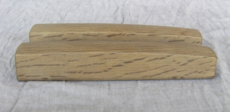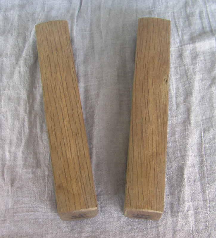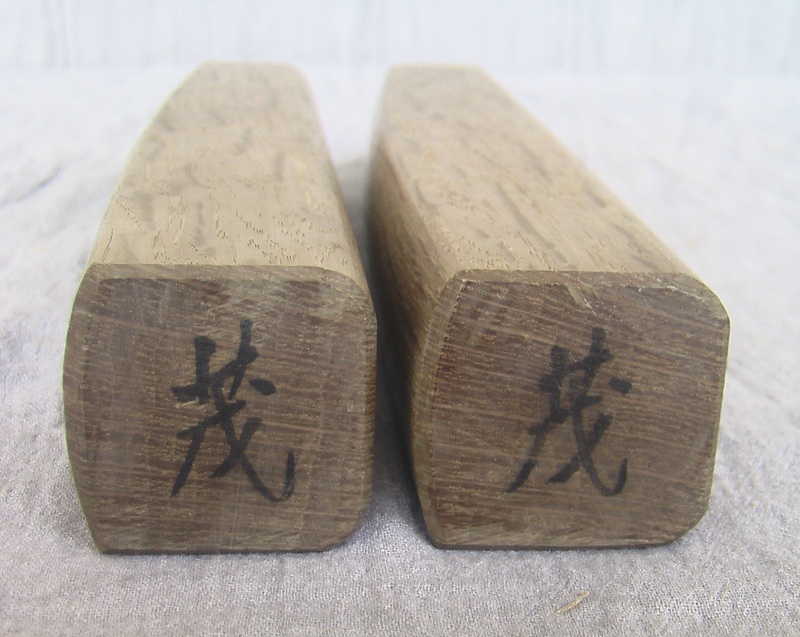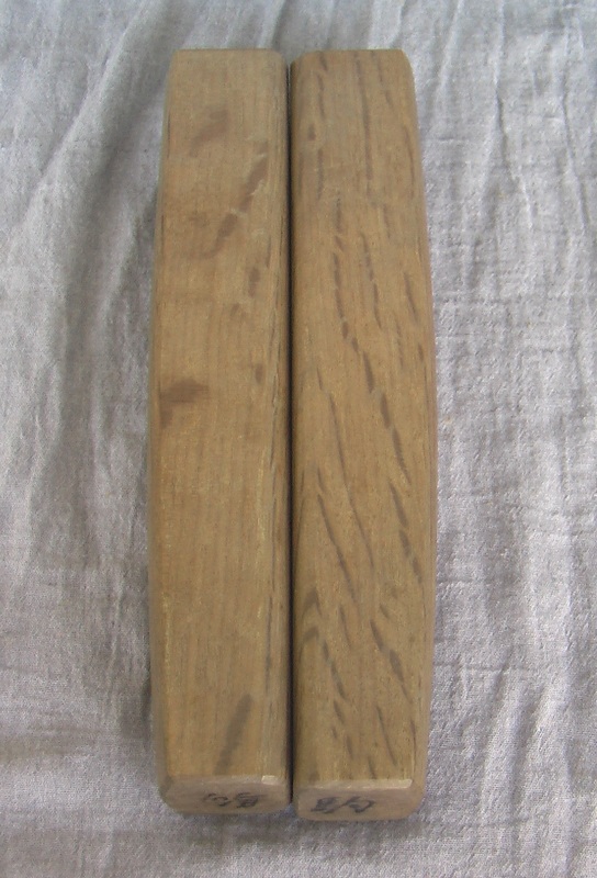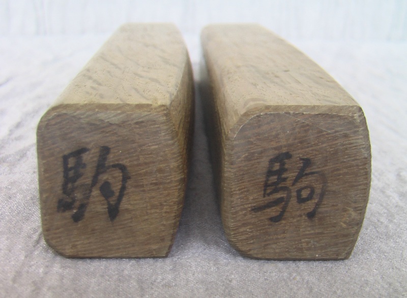 The hyoshigi is comprised of two identical solid rectangular blocks of an unknown variety of hardwood (gallery #1). One of the wider faces of each block is absolutely flat (detail #1), and it is these two faces that are concussed against one another. The opposite face of each block is slightly arched (detail #2). The end of each block is marked with a Japanese character, a different one at each end (see details #3 and #4)