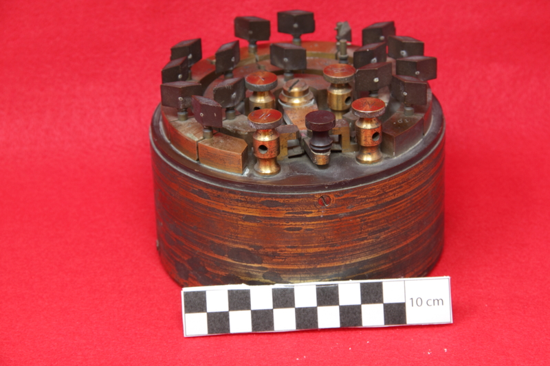 Circular resistance box manufactured by L. Bradley & Co. in Chicago. Patent date is Jan. 7, 1873. Construction of box consistent with 1870s technology. Box was probably used in trouble shooting telegraph or possibly telephone lines. We have no further information about the box.